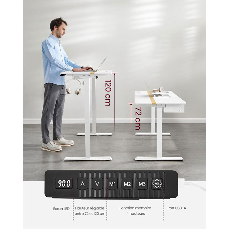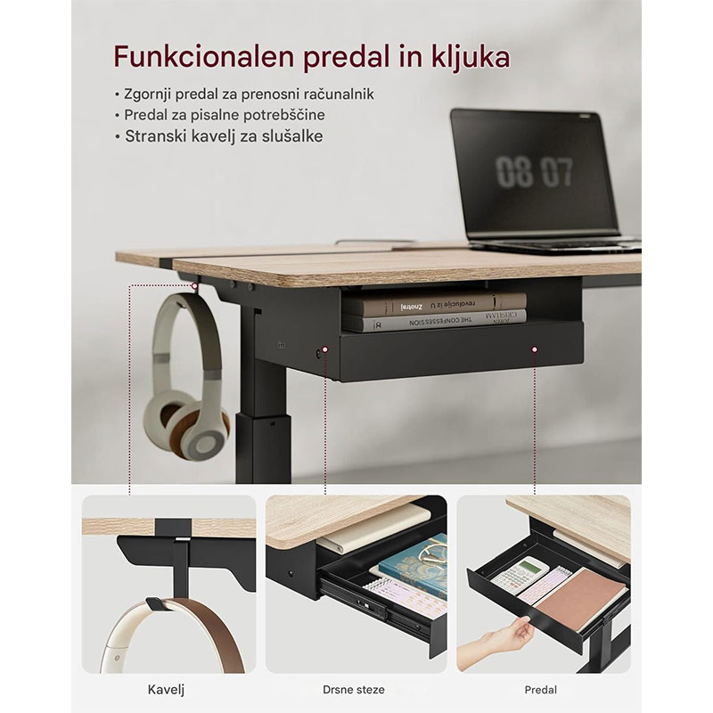 , pa jednim pritiskom gumba možete brzo prijeći na svoje omiljene postavke. Njegova prostrana radna površina veličine 60 × 140 cm nudi dovoljno mjesta za računalo, monitor, dokumente i druge radne potrepštine, što doprinosi urednom i učinkovitom radnom prostoru. Zahvaljujući