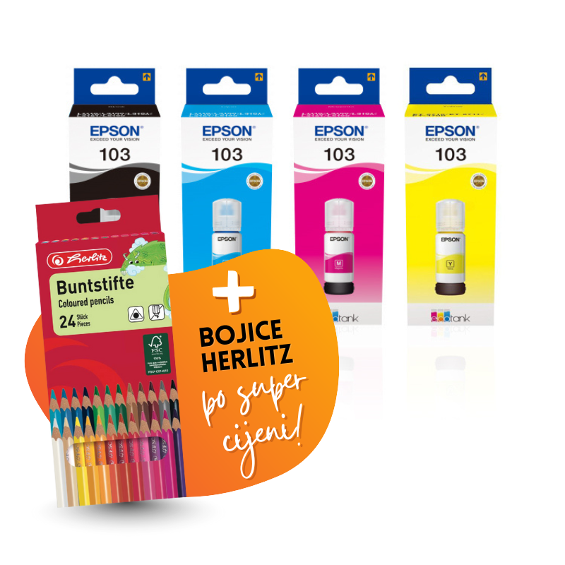 Komplet uključuje: originalne tinte Epson 103 (BK + CMY) i Bojice Herlitz, 24 komada.