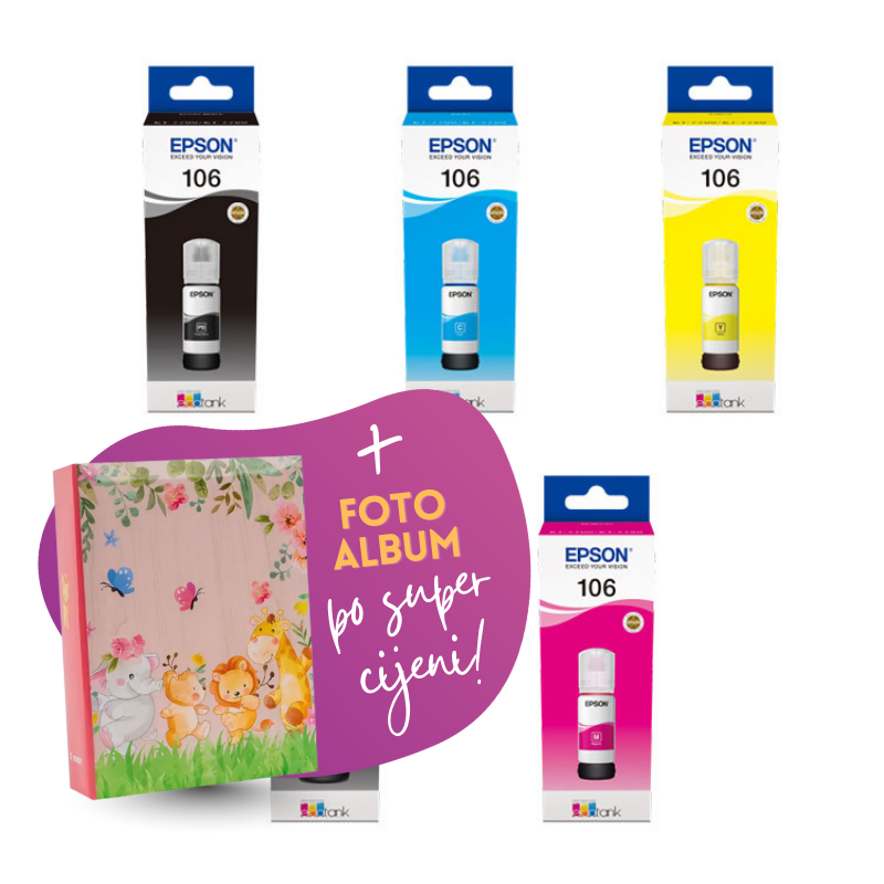 Komplet uključuje: originalne tinte Epson 106 (BK + CMY) i Foto album Safari 2, 100 slika.