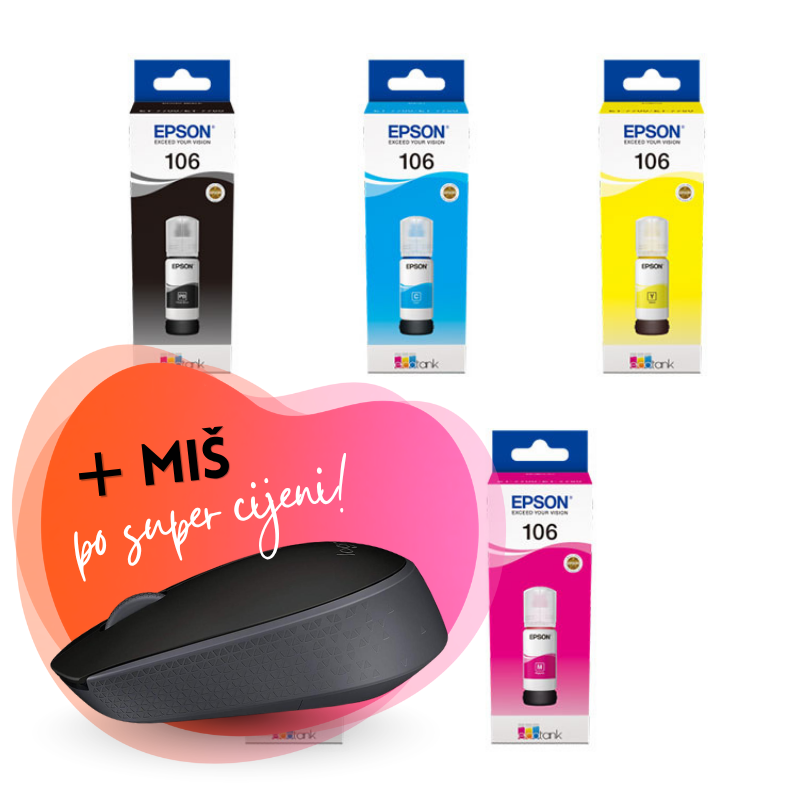 Komplet uključuje: originalne tinte Epson 106 (BK + CMY) i Miš Logitech M171 Wireless, bežični, sivi.