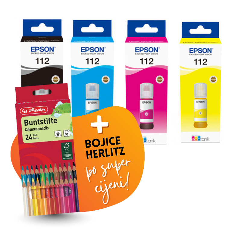 Komplet uključuje: originalne tinte Epson 112 (BK + CMY) i Bojice Herlitz, 24 komada.