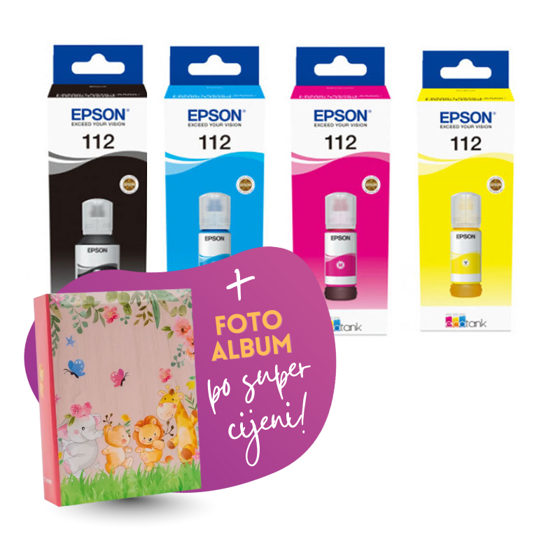 Komplet uključuje: originalne tinte Epson 112 (BK + CMY) i Foto album Safari 2, 100 slika.