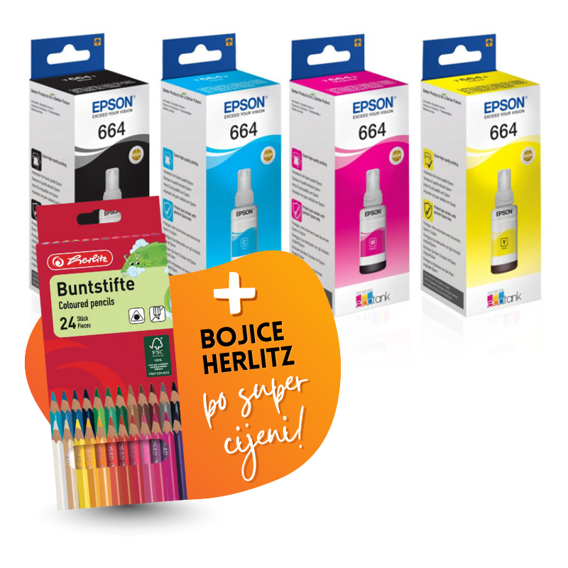 Komplet uključuje: originalne tinte Epson T664 (BK + CMY) i Bojice Herlitz, 24 komada.
