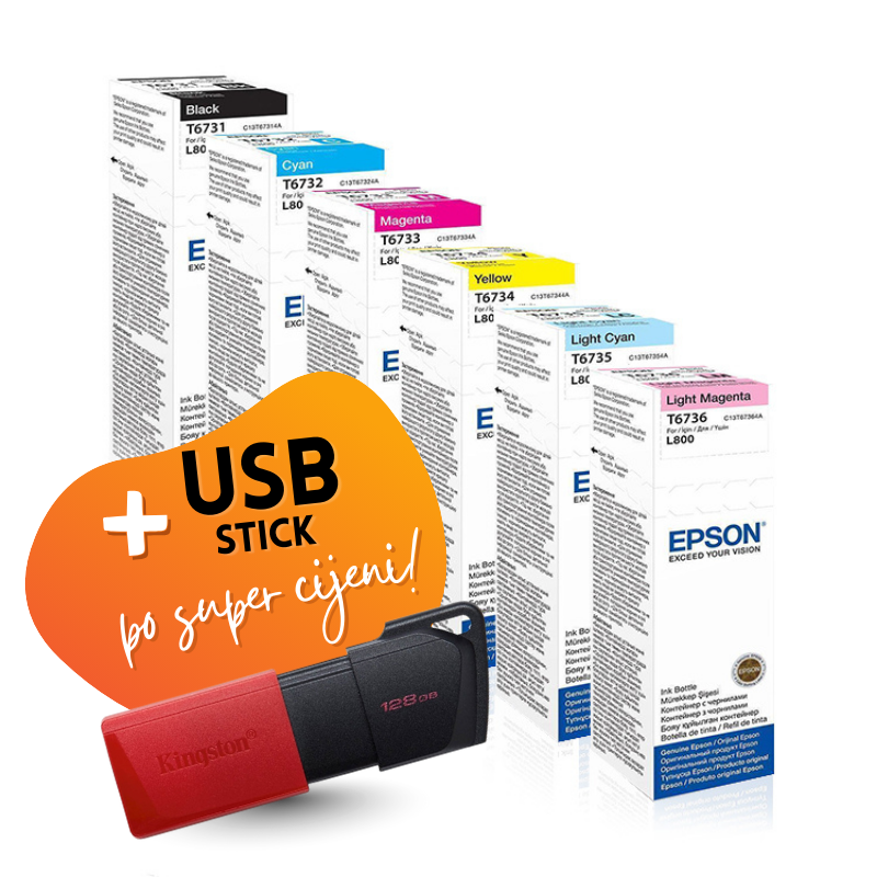 Komplet uključuje: originalne tinte Epson T673 (BK + CMY) i USB stick Kingston DTX Exodia M, 128 GB.