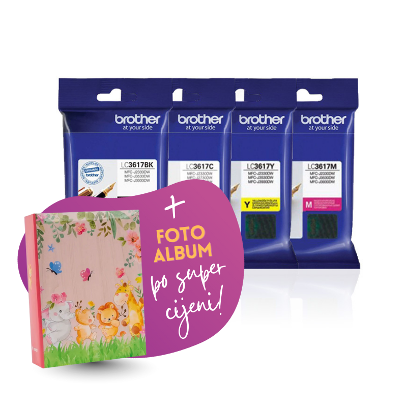 Komplet uključuje: originalne tinte Brother LC3617 (BK/C/M/Y) i Foto album Safari 2, 100 slika.
