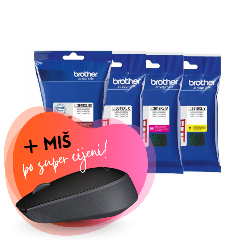 Komplet uključuje: originalne tinte Brother LC3619XL (BK/C/M/Y) i Miš Logitech M171 Wireless, bežični, sivi.