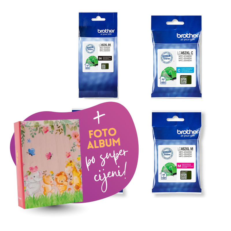 Komplet uključuje: originalne tinte Brother LC462 XL (BK/C/M/Y) i Foto album Safari 2, 100 slika.