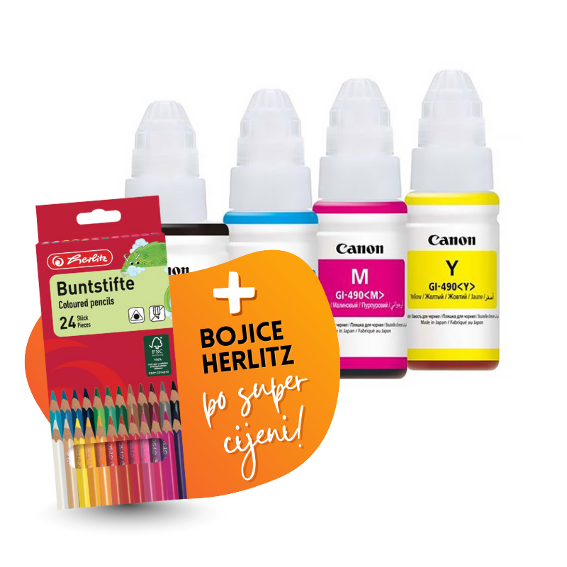 Komplet uključuje: originalne tinte Canon GI-490 (BK/C/M/Y) i Bojice Herlitz, 24 komada.