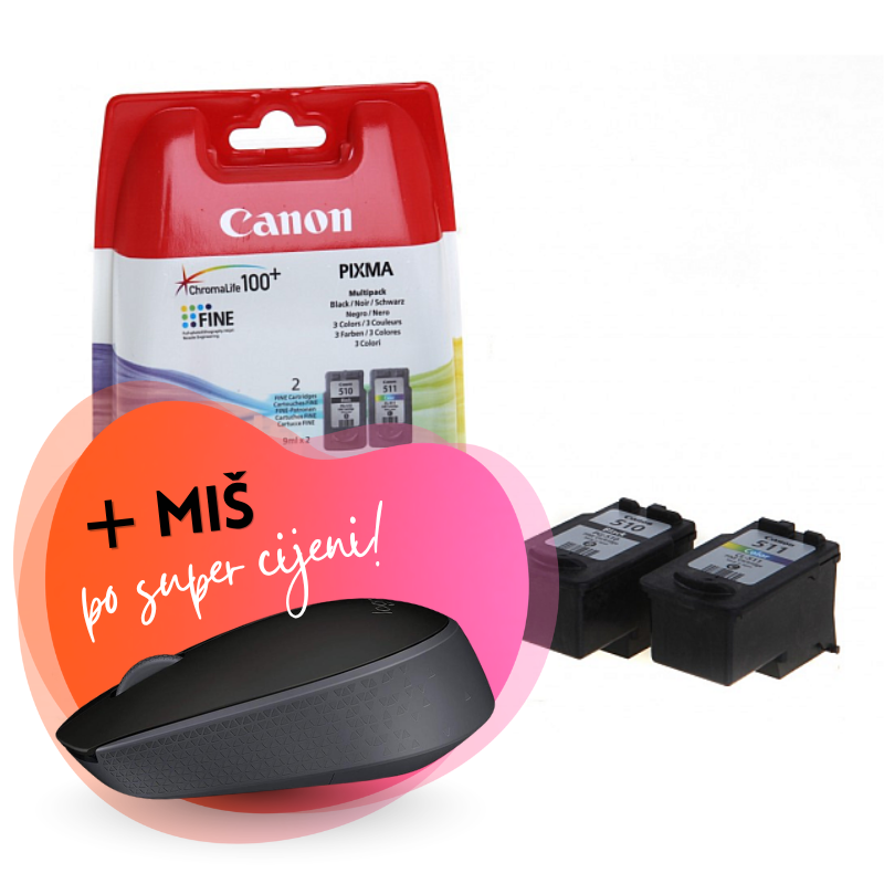 Komplet uključuje: originalne tinte PG-510 + CL-511 (BK + CMY) i Miš Logitech M171 Wireless, bežični, sivi.