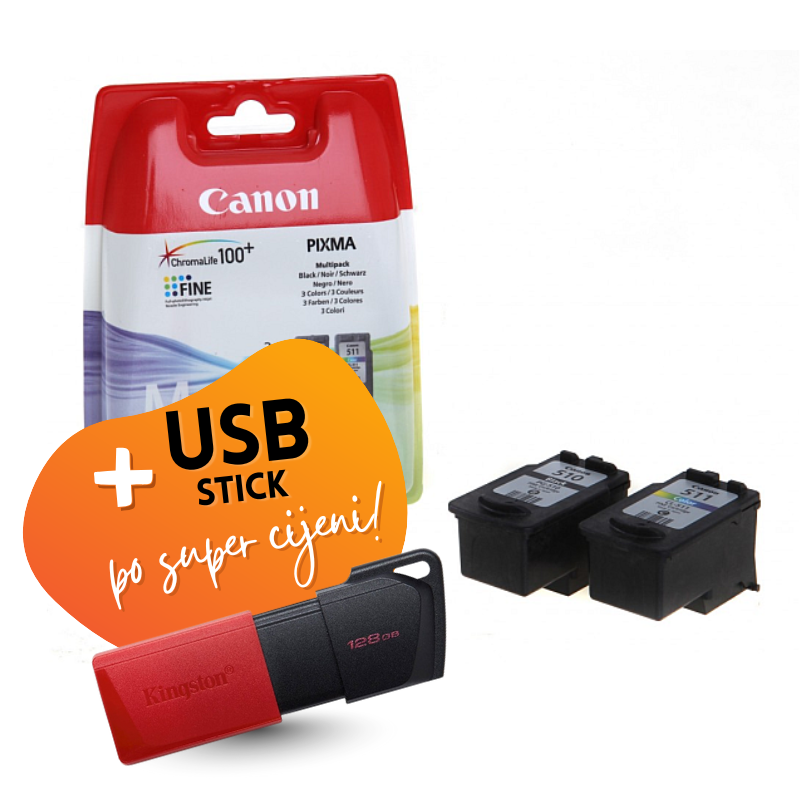 Komplet uključuje: originalne tinte PG-510 + CL-511 (BK + CMY) i USB stick Kingston DTX Exodia M, 128 GB.