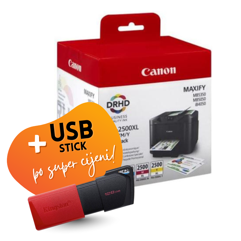 Komplet uključuje: originalne tinte Canon PGI-2500XL (BK/C/M/Y) i USB stick Kingston DTX Exodia M, 128 GB.