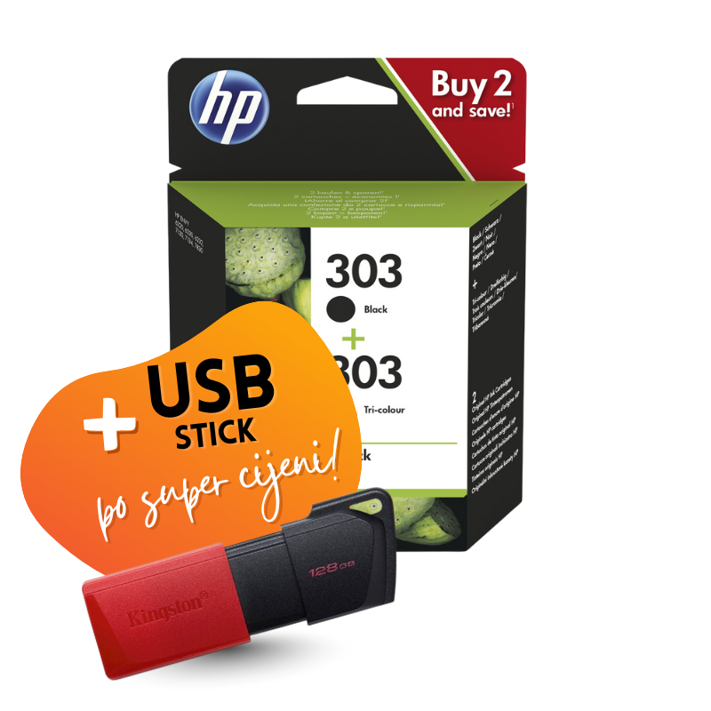 Komplet uključuje: originalne tinte HP nr.303 (BK + CMY) i USB stick Kingston DTX Exodia M, 128 GB.