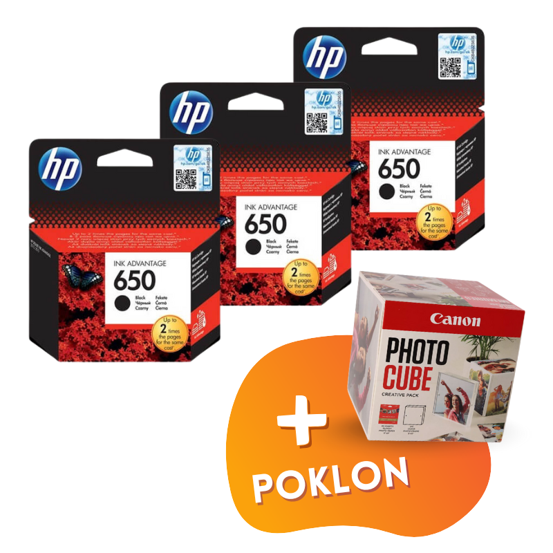 Komplet uključuje: Original tinte HP CZ101AE nr.650 (crna), 3 komada i Foto kocka Canon Creative Pack s foto papirom i okvirom.
