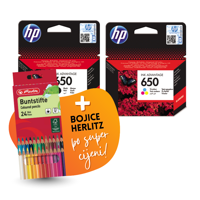 Komplet uključuje: originalne tinte HP nr.650 (BK + CMY) i Bojice Herlitz, 24 komada.