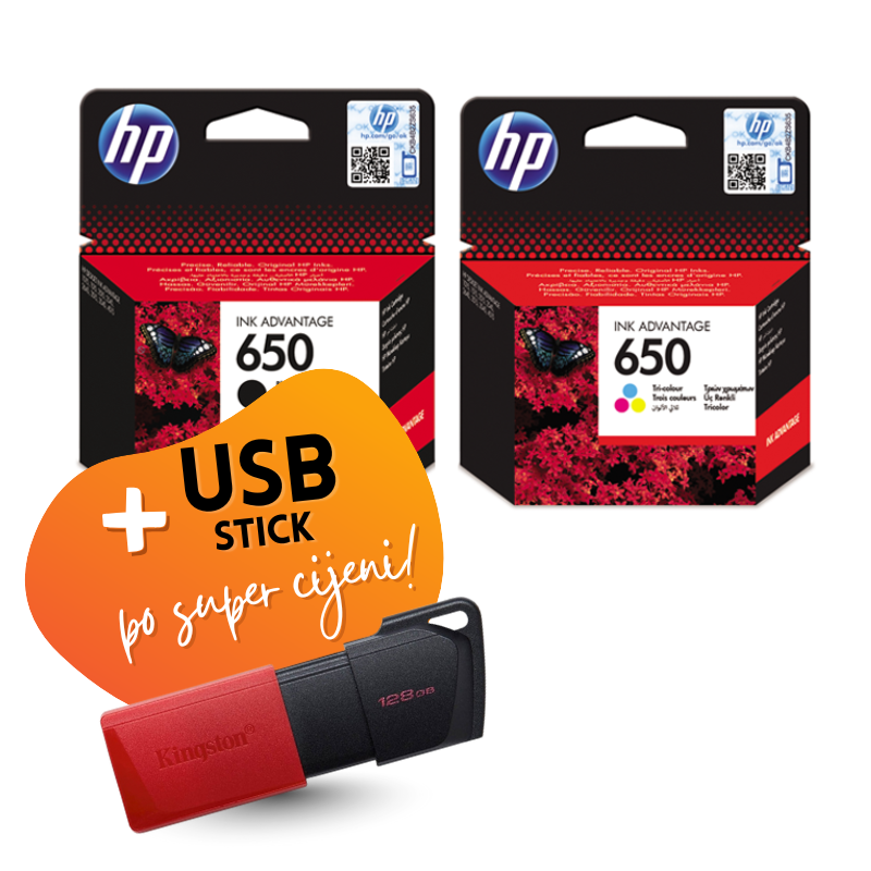 Komplet uključuje: originalne tinte HP nr.650 (BK + CMY) i USB stick Kingston DTX Exodia M, 128 GB.