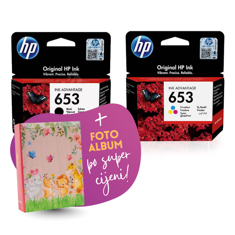 Komplet uključuje: originalne tinte HP nr.653 (BK + CMY) i Foto album Safari 2, 100 slika.