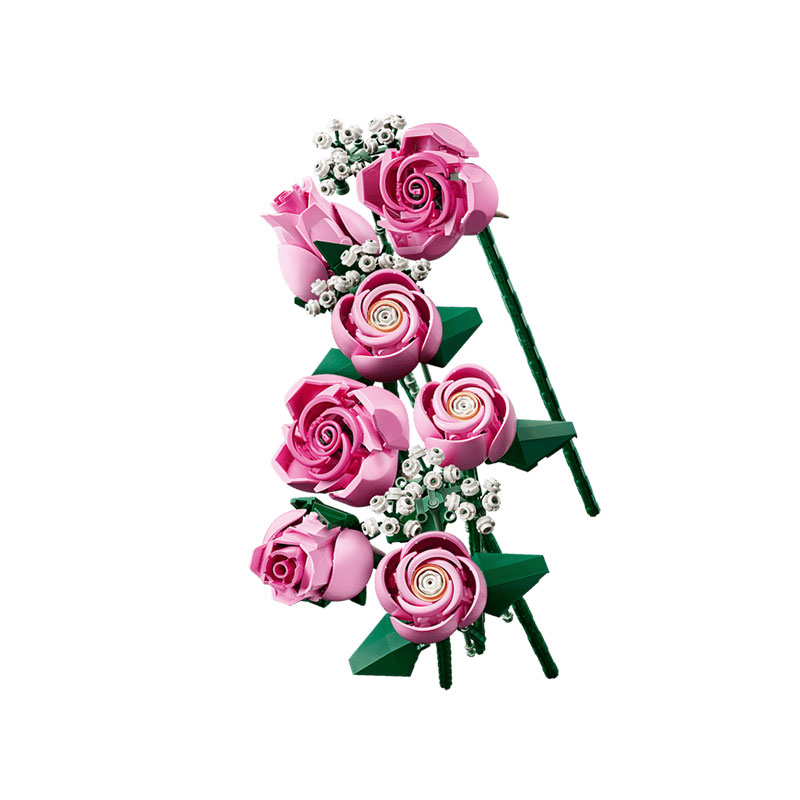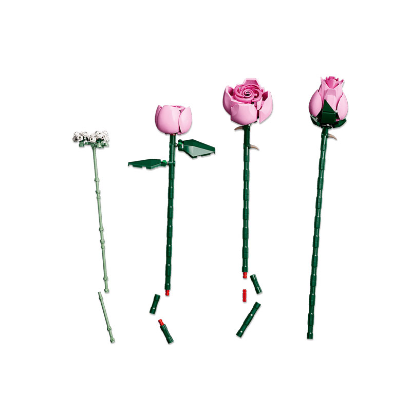 – 4 potpuno otvorena cvijeta, 4 cvjetajuće ruže i 4 pupoljka. Cvjetovi su oblikovani s nježnim prijelazima ružičastih tonova, što im daje prirodniji izgled. Buket upotpunjuju 4 grančice gypsophila s malim bijelim cvjetovima, koje aranžmanu dodaju eleganciju.