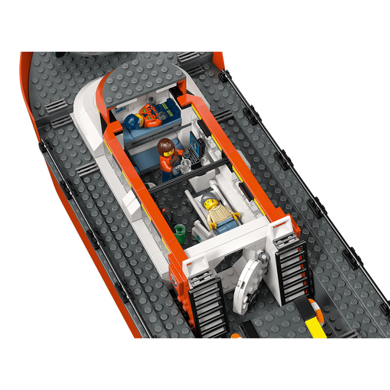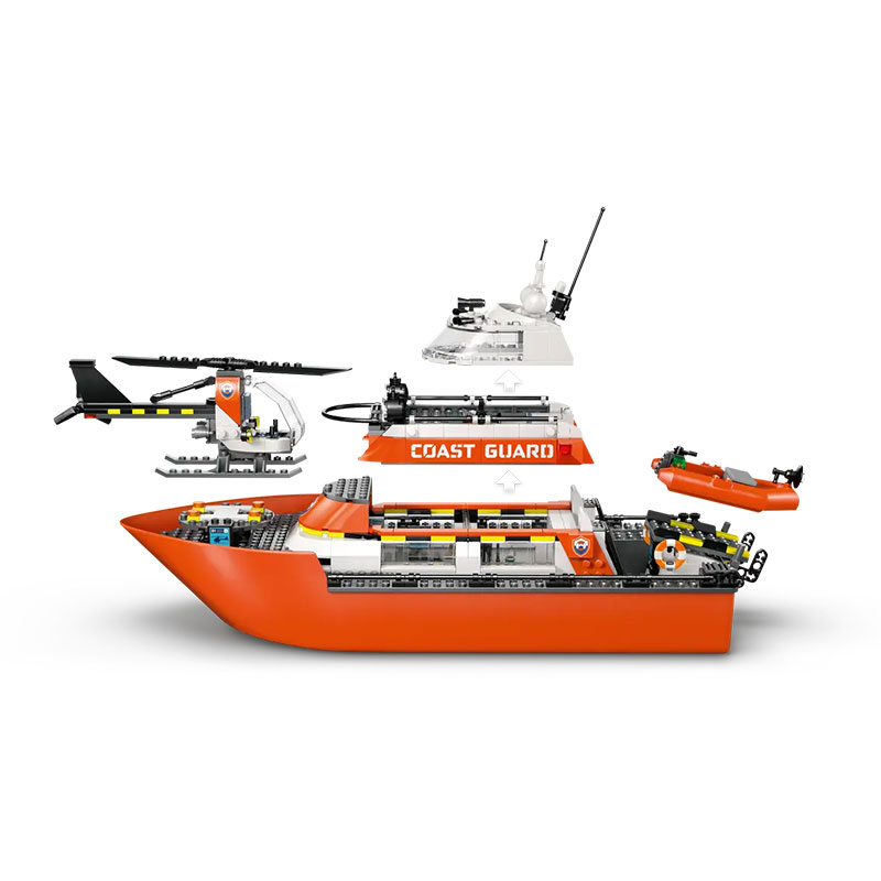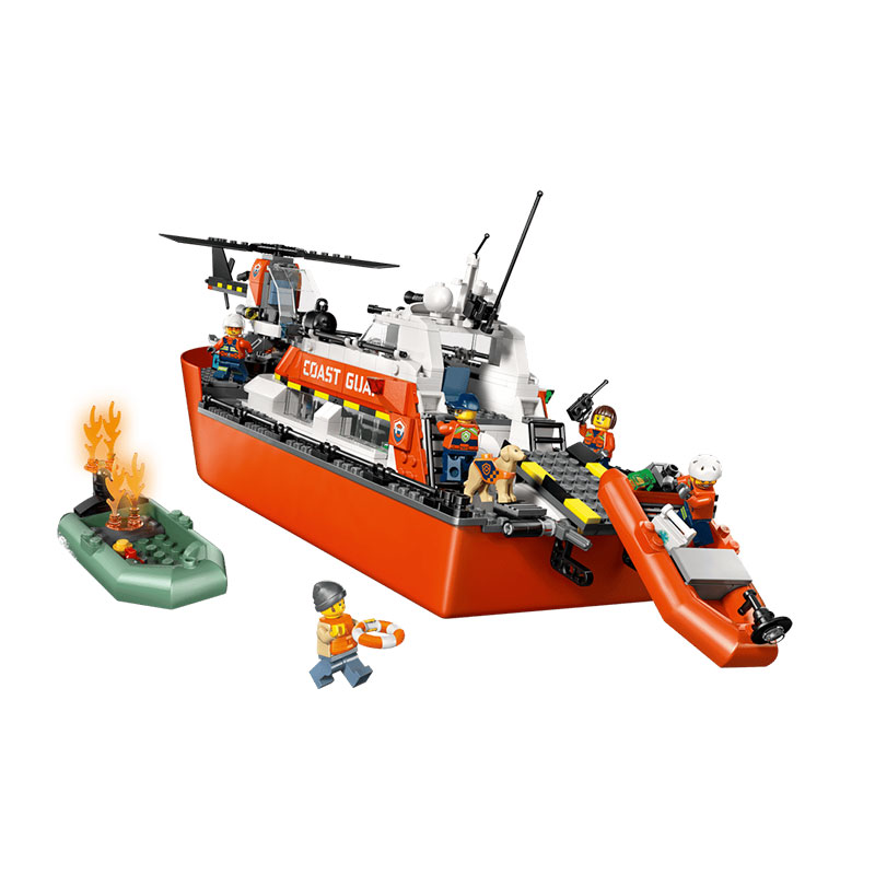 s uklonjivim slojevima palube za lakši pristup zapovjednom mostu, spavaćim sobama i kuhinji. Djeca mogu lansirati spasilački čamac s rampe ili poslati helikopter s palube. Set također sadrži dodatna 2 čamca, LEGO plamenove, 5 mini figura i spasilačkog psa za sate maštovite igre i kreiranje priča.