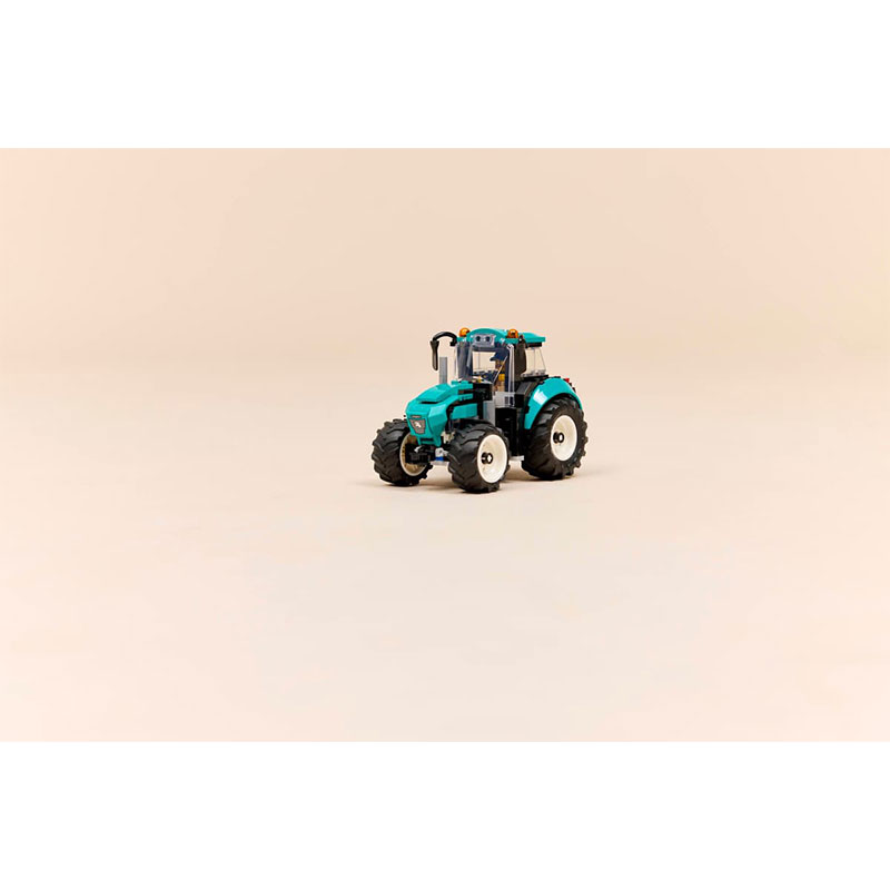 u svježoj tirkiznoj kombinaciji boja i s četiri velike gumene traktorske gume, koje osiguravaju realističan izgled i igru. Mladi graditelji mogu ukloniti krov kabine, smjestiti mini figuricu farmera u traktor te otvoriti poklopac motora i pogledati njegov unutarnji dio prije nego što krenu u uzbudljive seoske avanture.