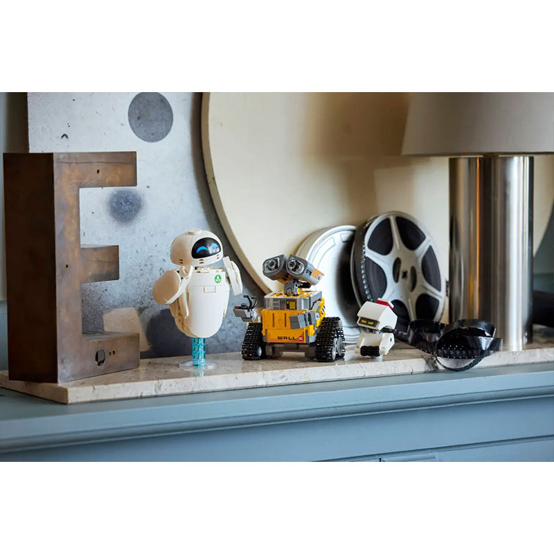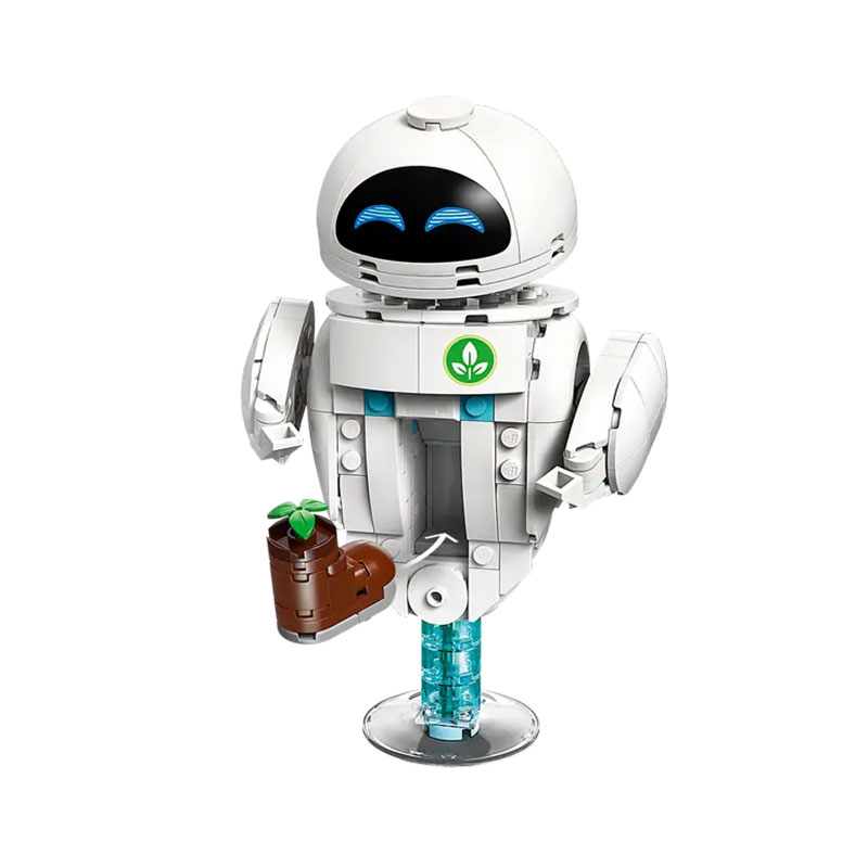 : WALL-E, EVE, M-O i Hal, zajedno s prepoznatljivim detaljima iz filma, među kojima se ističe ikonična biljka u čizmi. WALL-E ima pokretne gusjenice, M-O ima rotirajuću četku, a svi likovi imaju pokretne ruke i glave.