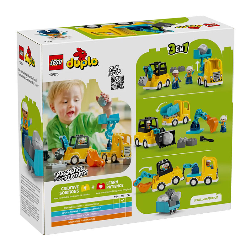 Šareni i kreativni set koji malim polaznicima omogućuje prve zabavne korake u svijet slaganja. Set omogućuje sastavljanje čak šest različitih vozila, poput utovarivača s nagibnim koritom, prevrtljivog kamiona, bagera, automobila s dizalicom i okretnom ručkom ili dizalice s manjim kukom, čime djeca razvijaju maštu, rješavanje problema, upornost i finu motoriku. Uključene su i dvije figurice. Jednostavne, sigurne i ugodne LEGO DUPLO kocke su