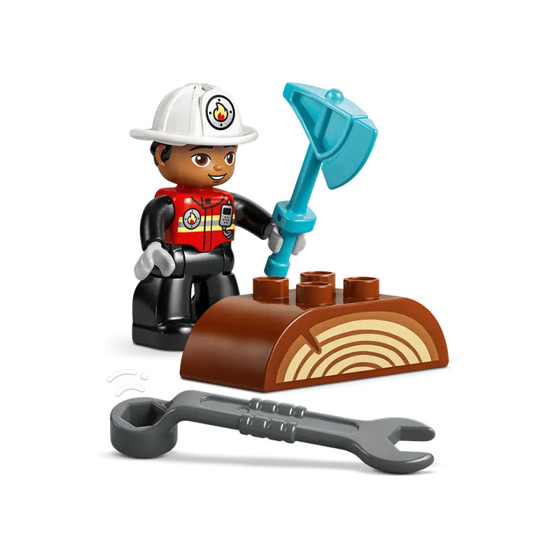 Šareni i kreativan set koji malim istraživačima omogućuje prve zabavne korake u svijet slaganja. Djeca kroz igru preuzimaju ulogu hrabrog vatrogasca, razvijaju empatiju i emocionalnu inteligenciju te uče kako pomagati drugima. Set uključuje vatrogasno vozilo s nagibnom ljestvom, prozirni spremnik za vodu, fleksibilno crijevo, drvo i LEGO DUPLO vjevericu, što potiče maštovite spasilačke priče. Pokretni priključak vozila omogućuje lakše manevriranje po zavojima, dok slaganje i manipulacija kockicama razvijaju finu motoriku. Jednostavne, sigurne i ugodne LEGO DUPLO kockice