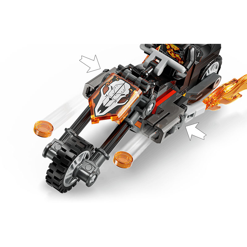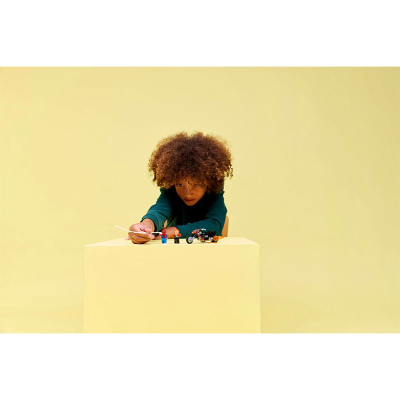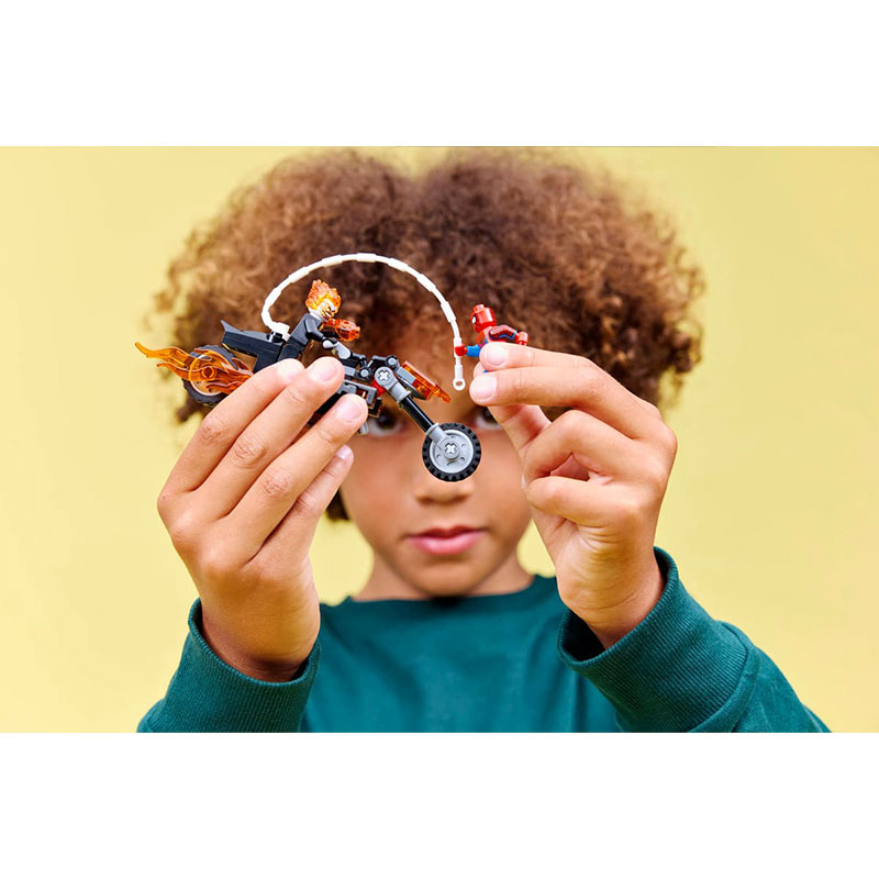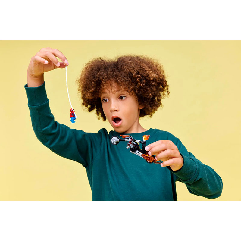 Zabavan građevinski set namijenjen svim obožavateljima superjunaka. Uključuje mini figure Spider-Mana i Ghost Ridera te borbeni motocikl.