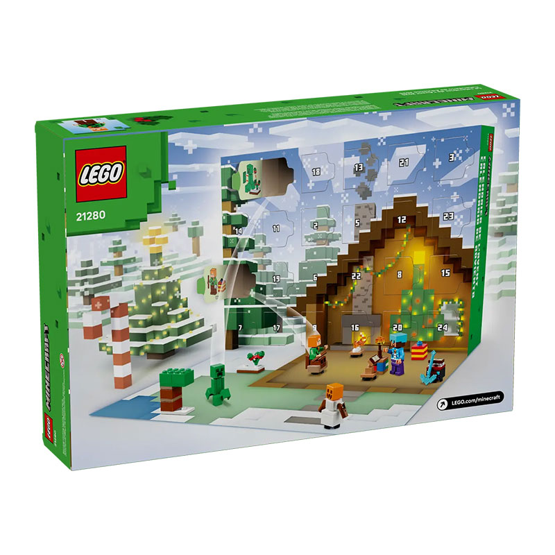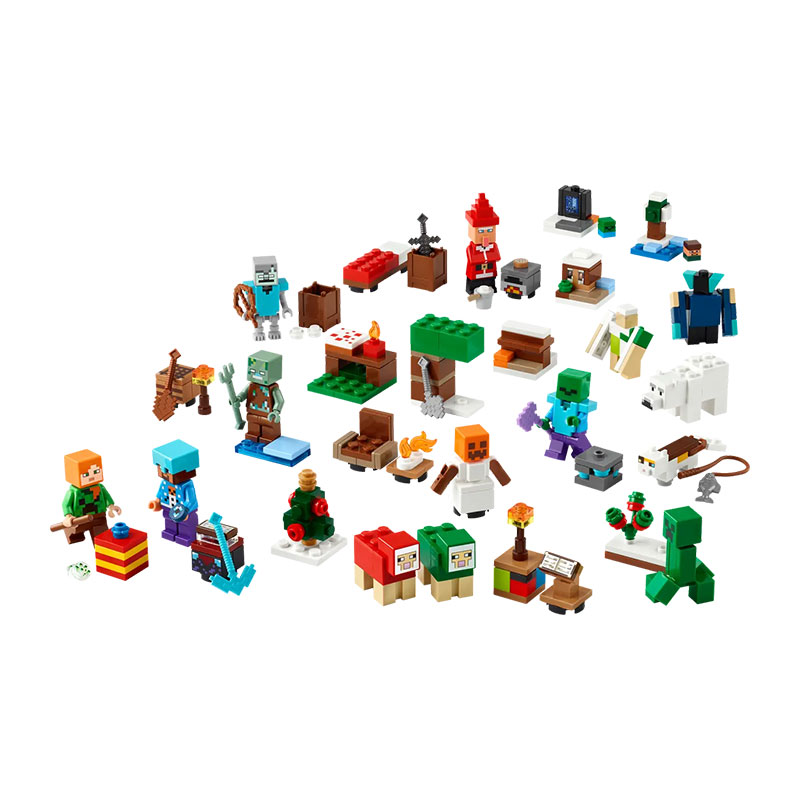 . Iza svakih vrata nalazi se novi LEGO element - savršeno iznenađenje za svaki dan prosinca. Set uključuje mnoge popularne likove i predmete iz igre, poput Alexa u Creeper džemperu, Stevea u snježnom džemperu, dijamantnoj kacigi i pijuku, Creepera kraj grma jagode, utopljenika s trozubom, kostura u dijamantnom oklopu, snježnog golema, zombija sa začaranom sjekirom i seoskog Djeda Mraza s peći. Osim toga, tu su i manje konstrukcije i dodaci koje će djeca odmah prepoznati iz igre.