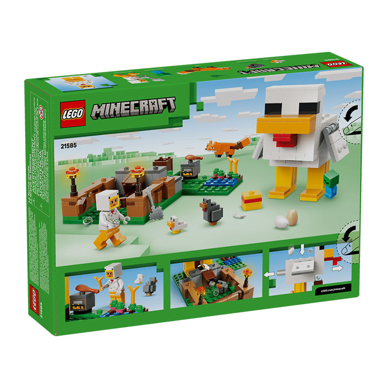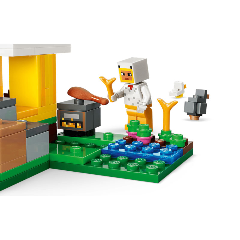 Zabavan građevni set namijenjen svim obožavateljima video igre Minecraft. Uključuje minifiguricu Chicken Fan te figure odraslog pijetla, pilića, lisice i mladog zombija, što stvara zabavno i dinamično igraće okruženje. Pileća farma oblikovana je kao velika figura pilića s pokretnim krilima i ogradom s pomičnim vratima.