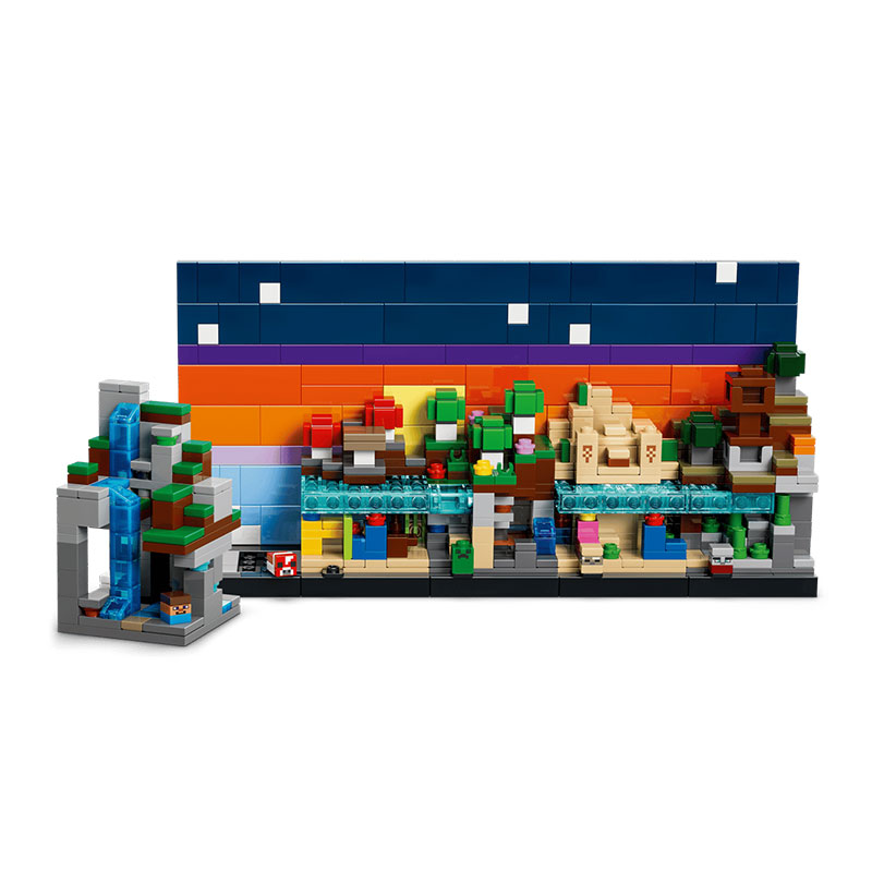 : planinu s kapnikom, ametistnu geodu i slap; cvjetnu šumsku zonu s podzemnom jamom, lavom i zlatom; polje gljiva s koraljnim grebenom, olupinom broda i crvenim te smeđim gljivama; pustinju s hramom, koraljnim grebenom, oceanom, kaktusima i blagom u sanduku; te savanu s postajom pillagera, bujnom jamom, akacijama, bundevama, lavom i plažom. Set uključuje i