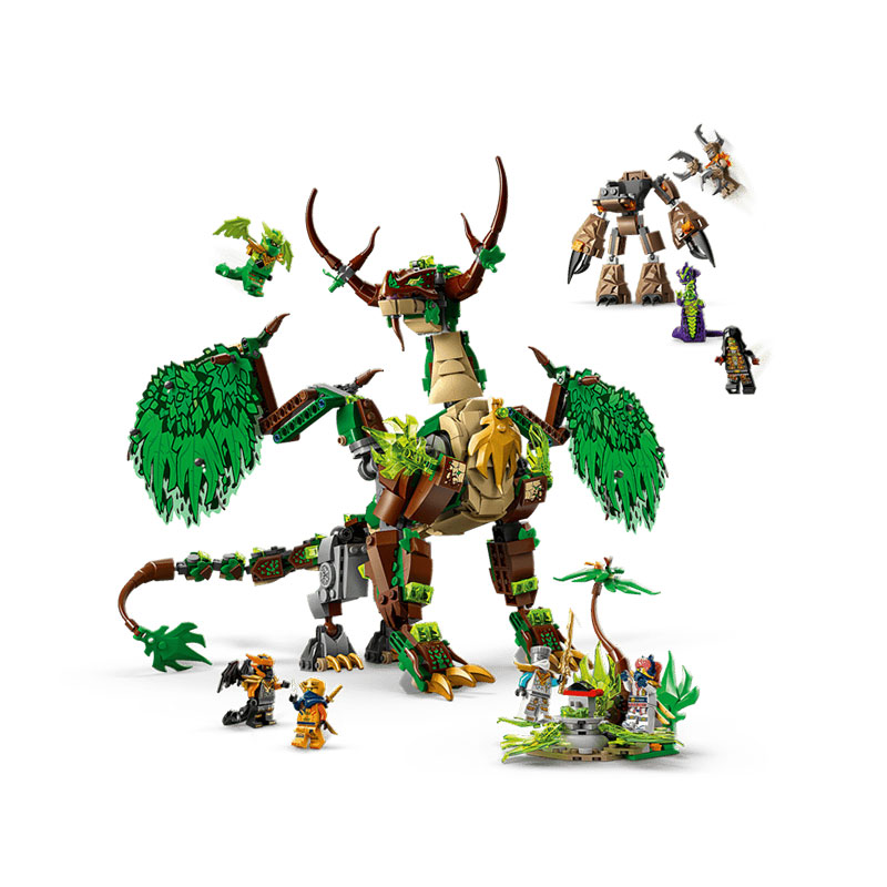 Zabavan građevni set namijenjen svim obožavateljima TV-serije NINJAGO Dragons Rising. S ovim setom djeca mogu sastaviti moćnog zmaja s raširenom ili skupljenom krilnom strukturom te pokretnim čeljustima, glavom, vratom, nogama, gležnjevima, kandžama, repom i sedlom za mini figuricu. Set uključuje i dodatnu zgradu s drvetom i rotirajućom biljkom koja skriva zlatni mač, kao i pokretni mini mech s kabinom za mini figuricu. Komplet