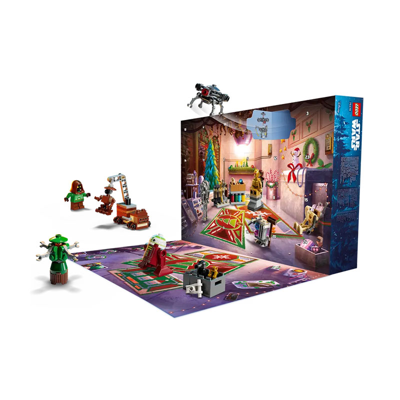 . Iza svakih vrata nalazi se novi LEGO element - savršeno iznenađenje za svaki dan prosinca. Set uključuje mnoge popularne likove, poput BB-8 u snježnom odijelu, Jawe, mišjeg droida i medicinskog droida u svečanoj odjeći, kao i droida majstora Babua Frika.