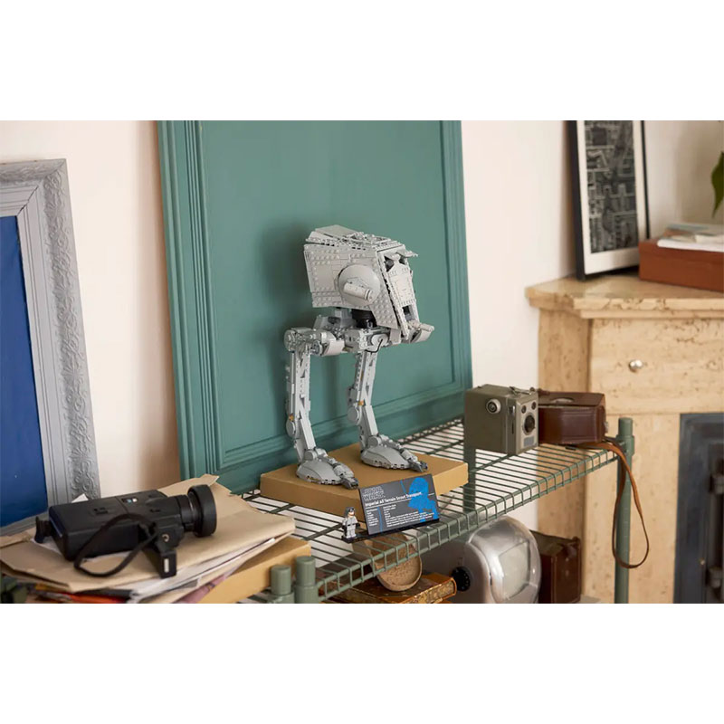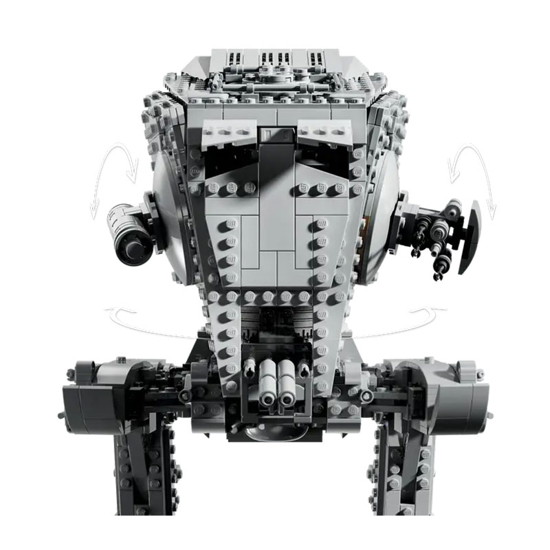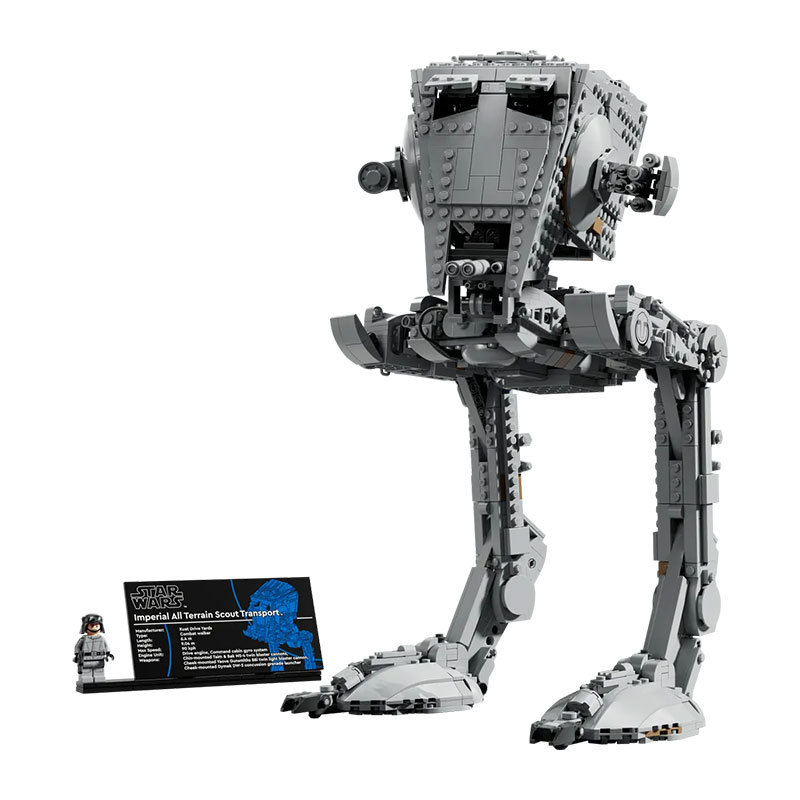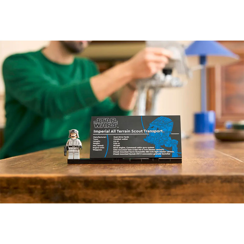 AT-ST-a, otvaranjem i zatvaranjem prozorskih poklopaca te podešavanjem laserskih topova. Set uključuje informativnu pločicu i ekskluzivnu LEGO® Star Wars minifiguru AT-ST Drivera s otisnutim imperijskim grbom na rukama, što upotpunjuje impresivan kolekcionarski eksponat.
