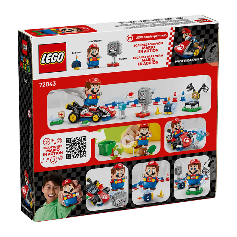 za autentično Mario Kart iskustvo. Set sadrži startnu poziciju, povezive ograde staze, prometne stošce i ciljnu rampu za pobjednika. Na stazi se igrači mogu natjecati protiv protivnika Bob-omba i Thwompa, skupljati digitalne nagrade iz Item Boxa te pratiti kako LEGO Mario reagira na zelene i crvene LEGO pločice