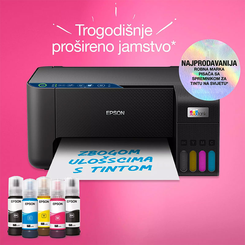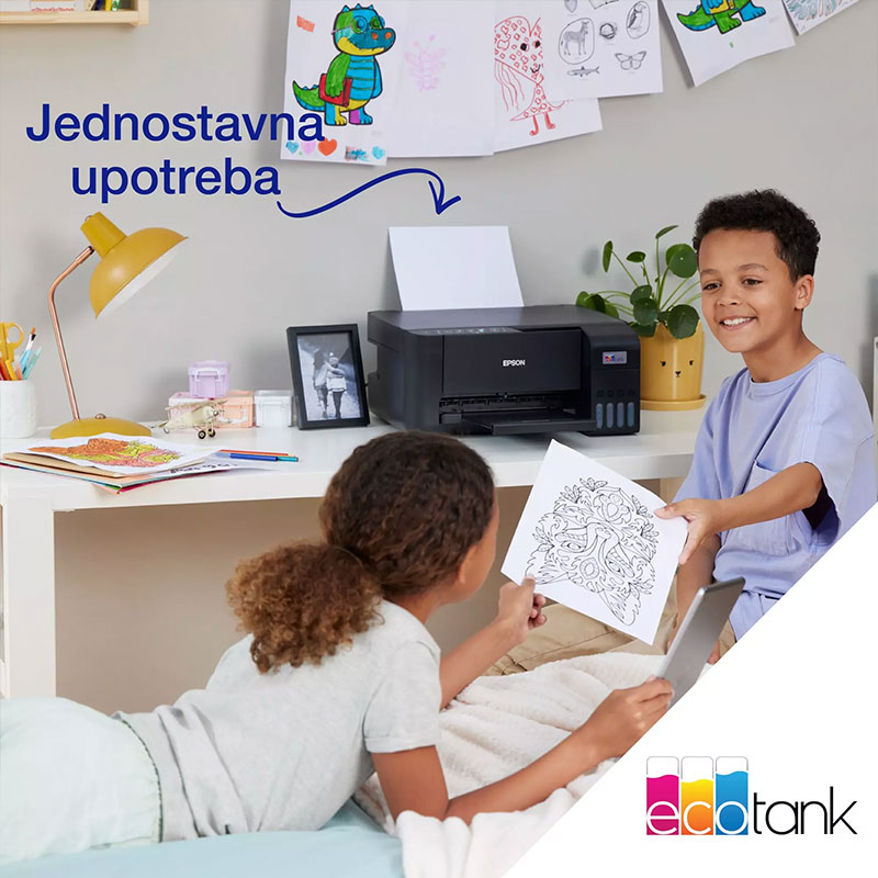 Uživajte u bežičnom ispisu i iznimno niskom trošku po stranici uz ovaj višenamjenski pisač EcoTank bez uložaka, savršen za moderna i užurbana kućanstva.