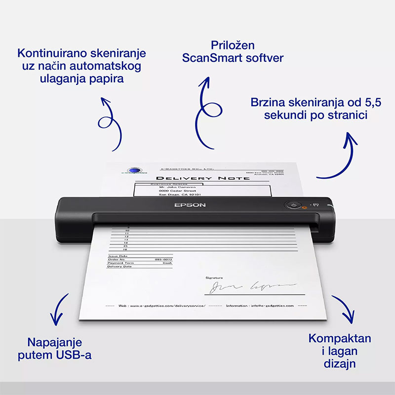 Optički skener ES-50 jednostavan je za upotrebu, a zbog kompaktne i praktične forme lako ga je postaviti i prenositi. Napaja se putem priloženog USB kabela preko prijenosnog ili stolnog računala. Idealan je za male ili kućne urede (Small and Home Office – SOHO) s ograničenim prostorom, gdje je potrebna jednostavna i učinkovita opcija za optičko skeniranje.