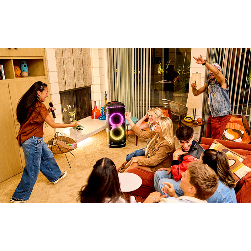 Izvanredan prijenosni zvučnik koji svako druženje ili zabavu podiže na višu razinu. Nudi vrhunski JBL Pro Sound, dubok i precizan bas te spektakularne svjetlosne efekte sa zvjezdanim svjetlima, tekućim trakama i pulsirajućim stroboskopima. S snagom do 800 W RMS, koju pokreću dva niskotonca i dva visokotonca, osigurava izuzetno glasan, uravnotežen i kristalno čist zvuk s naglašenim snažnim basovima.