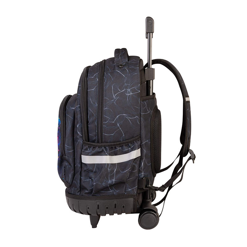 Izdržljiv, ovalni, školski ruksak na kotačiće, osigurava potpuno rasterećenje leđa. Sadrži podesive, funkcionalne i izuzetno udobne naramenice koje vam omogućuju da ga nosite cijeli dan bez nelagode ili boli. Uključuje veliku prostranu unutrašnjost koja će osigurati organizirano nošenje raznih stvari. Također ima niz pretinaca i džepova, uključujući prostrani prednji džep i bočne džepove koji su idealni za spremanje manjih predmeta kao što su ključevi, novčanik, mobilni telefon i boca za vodu . Posebnost ovog ruksaka su kotačići koji su dodani radi lakšeg rukovanja. Tako da ga možete jednostavno gurnuti ili povući kada želite olakšati pritisak na leđima. Izrađen je od izdržljivog poliestera koji je otporan na habanje, što osigurava dug radni vijek.