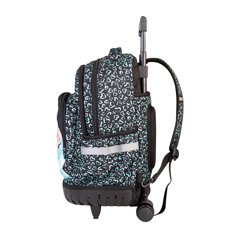 Izdržljiv, ovalni, školski ruksak na kotačiće, osigurava potpuno rasterećenje leđa. Sadrži podesive, funkcionalne i izuzetno udobne naramenice koje vam omogućuju da ga nosite cijeli dan bez nelagode ili boli. Uključuje veliku prostranu unutrašnjost koja će osigurati organizirano nošenje raznih stvari. Također ima niz pretinaca i džepova, uključujući prostrani prednji džep i bočne džepove koji su idealni za spremanje manjih predmeta kao što su ključevi, novčanik, mobilni telefon i boca za vodu . Posebnost ovog ruksaka su kotačići koji su dodani radi lakšeg rukovanja. Tako da ga možete jednostavno gurnuti ili povući kada želite olakšati pritisak na leđima. Izrađen je od izdržljivog poliestera koji je otporan na habanje, što osigurava dug radni vijek.