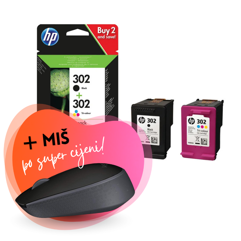 Komplet uključuje: originalne tinte HP nr.302 (BK + CMY) i Miš Logitech M171 Wireless, bežični, sivi.