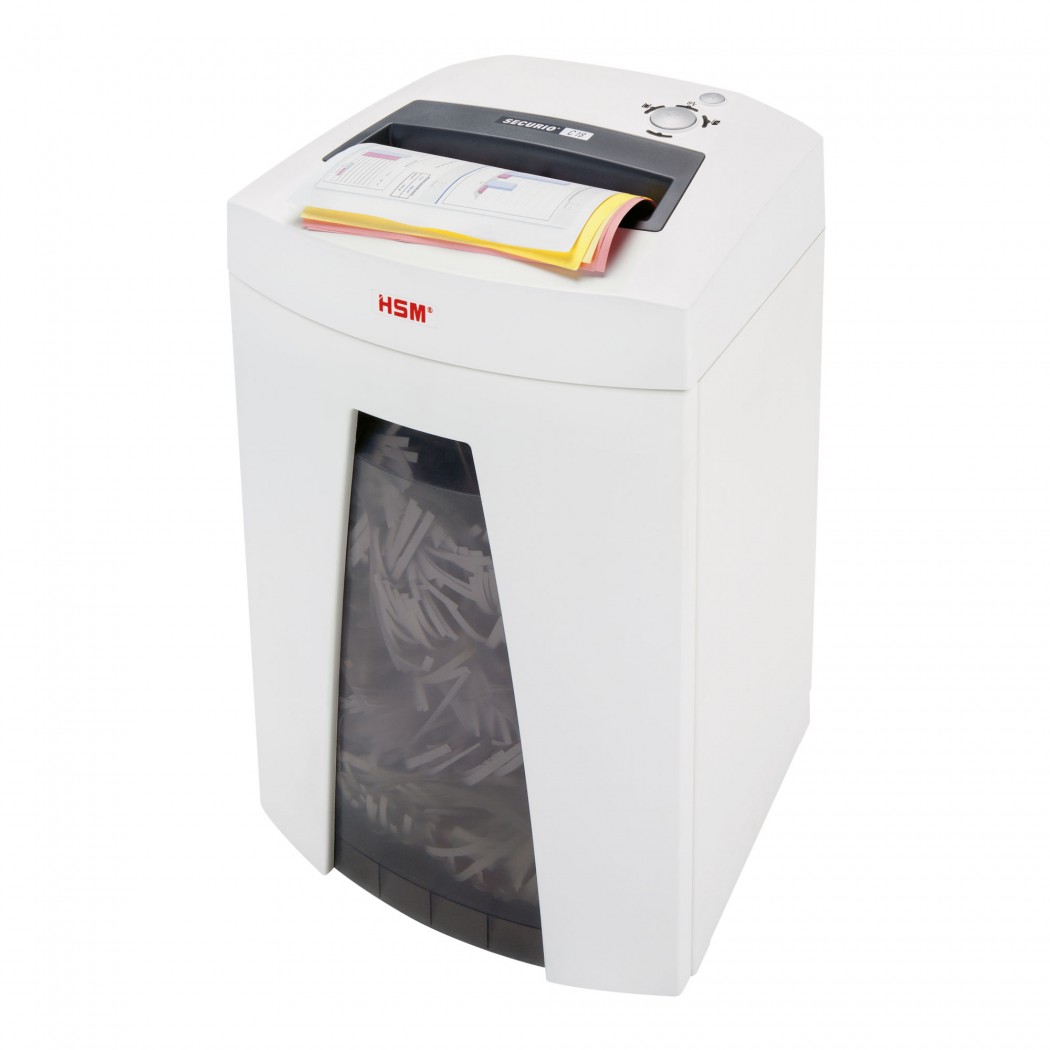HSM Uništavač dokumenata, u novoj seriji SECURIO, omogućuje vam tih rad i uštedu energije. Kroz otvor od 230mm možemo rezati od 17-19 listova 80g na trake (5,8mm). Zapremina spremnika, u kojega upadaju rezani komadi papira, spajalica i kartica je 25L i lako se prazni. Ima funkciju automatskog isključivanja-uključivanja, rezanja naprijed i nazad, u stanju mirovanja ne troši se električna energija. Posebna značajka je da noževi imaju doživotno jamstvo i 3 godine za rad.
